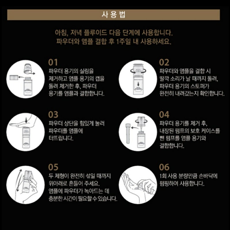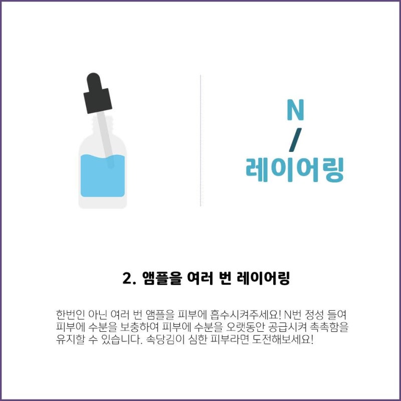 앰플은 언제 사용하면 되나요?최근 앰플은 피부 영양 공급과 피부 장벽 보호는 물론 광채와 부스팅 기능까지 다양한 용도로 출시되고 있습니다.따라서 스킨케어를 할 때 언제, 어떤 순서로 사용해야 할지 몰라 어려움을 겪는 경우가 있는데 스킨케어 마지막 단계에서 사용하는 일부 제품을 제외하면 대부분의 앰플은 스킨 또는 스킨 다음 단계에서 사용할 것을 권장하고 있습니다 기초 스킨케어 제품의 사용 순서는 스킨.토너 – 앰플, 세럼, 에센스 – 로션 – 크림입니다 스킨이나 토너로 피부결을 정돈한 후 입자가 작은 앰플이나 에센스, 세럼으로 피부 영양을 채우고 그 위에 로션이나 크림으로 피부 표면에 얇은 보호막을 씌워 준다고 생각하시면 알기 쉽습니다.알아두면 좋은 앰플 사용법