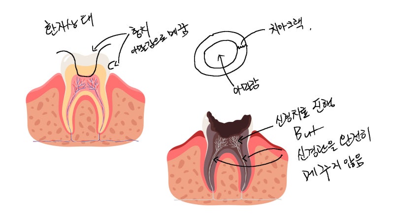 신경치료가 잘되면 통증이 느껴지지 않습니다. 그런데 어찌 보면 아이러니하게도 통증 때문에 가기 싫은 치과에 가서 신경과를 받았습니다. 부적절한 신경 치료와 아말감이 잘못 충전되어 제거하고 다시 신경을 쓰기로 결정했습니다. 치아의 균열이 잇몸선까지 내려가지 않아 잘 잡아줍니다.