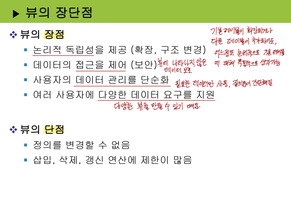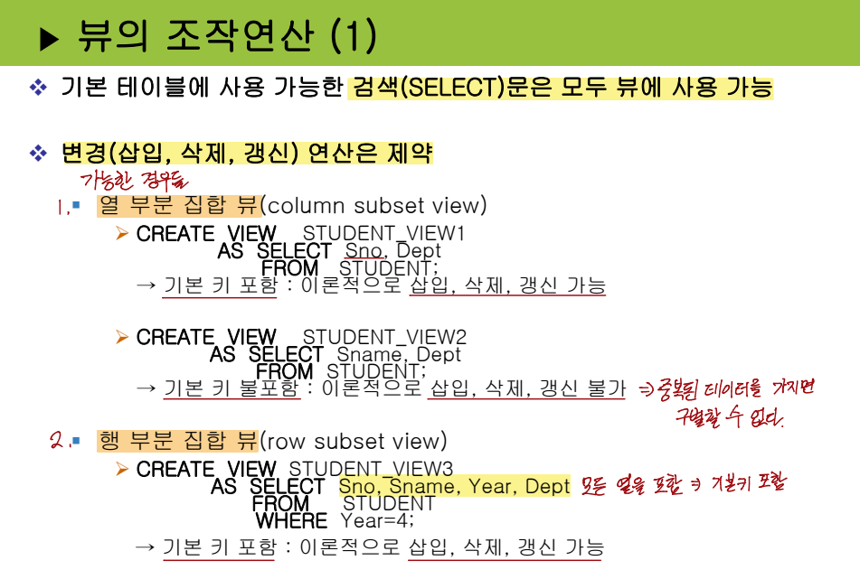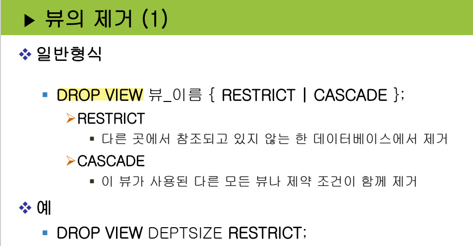 :데이터 정의 언어(DDL): 데이터베이스 스키마를 정의하고 수정하기 위한 명령입니다. 테이블, 뷰, 인덱스, 프로시저, 함수 등을 생성, 수정 또는 삭제할 수 있습니다.