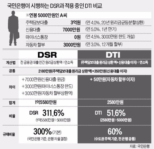 이를 스트레스 DSR이라고 합니다. 앞으로 오를 금리를 기준으로 한도를 계산하는 것이다. 이는 정산 시 일정 수준의 추가 이자율을 부과하는 제도이므로 대출 계획 시 주의가 필요합니다. 평균소득 5천만원 대출자의 경우 이 제도가 도입되면 대출한도가 변경된다. 40% 금리는 동일하지만 대출금액에 대한 이자율이 높아지므로 원금상환액은 늘어나고 대출한도는 줄어든다. 다만, 대출 한도가 과도하게 축소될 예정이어서 발생할 수 있는 어려움을 고려해 공개적으로 적용할 계획인 것으로 전해진다.